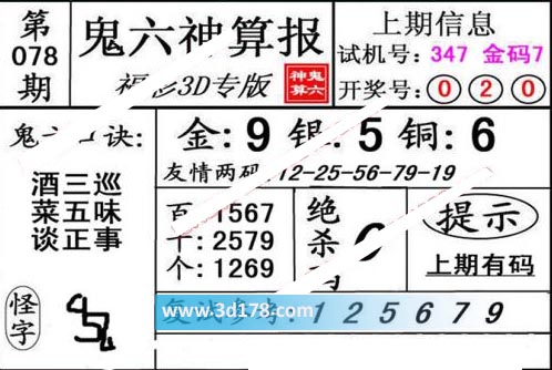 3d第20078期鬼六神算报为您推荐鬼六口诀: