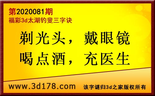 3d第20081太湖字谜:剃光头,戴眼镜,喝点酒,充医生