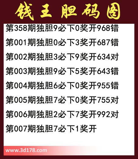 第358期独胆9必下0奖开968错第001期独胆0必下3奖开687错第002期独胆3必下9奖开634对第003期独胆9必下5奖开643错第004期独胆6必下0奖开955错第005期独胆7必下0奖开755对第006期独胆2必下7奖开992对第007期独胆7必下1奖开
