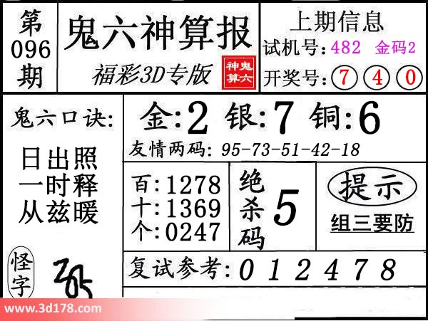 3d第20096期鬼六神算报为您推荐鬼六口诀: