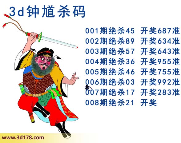 福彩3d之家第2014008期钟馗杀码图:001期绝杀45 开奖687准3002期绝杀89 开奖634准003期绝杀57 开奖643准004期绝杀36 开奖955准005期绝杀46 开奖755准006期绝杀03 开奖992准007期绝杀17 开奖283准008期绝杀21 开奖