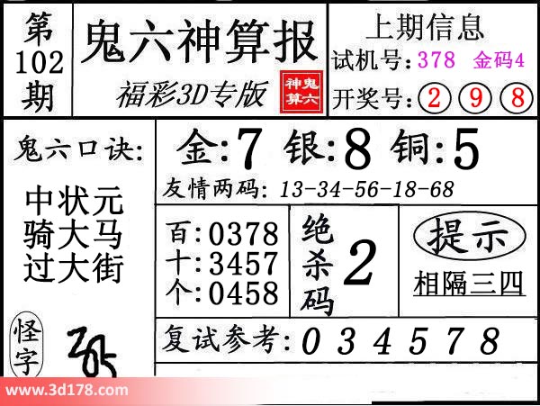 3d第20102期鬼六神算报为您推荐鬼六口诀: