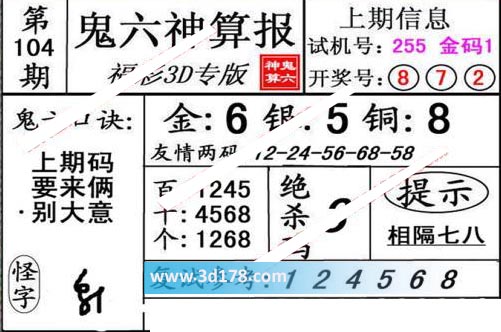 3d第20104期鬼六神算报为您推荐鬼六口诀: