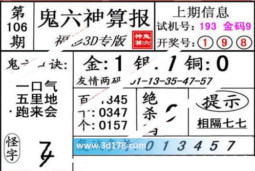 3d第20106期鬼六神算报为您推荐鬼六口诀: