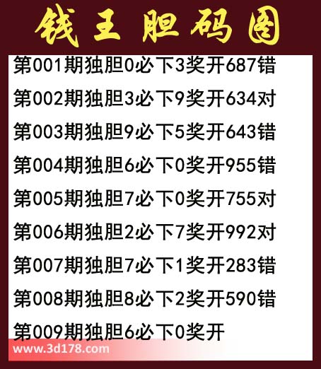 第001期独胆0必下3奖开687错第002期独胆3必下9奖开634对第003期独胆9必下5奖开643错第004期独胆6必下0奖开955错第005期独胆7必下0奖开755对第006期独胆2必下7奖开992对第007期独胆7必下1奖开283错第008期独胆8必下2奖开590错第009期独胆6必下0奖开