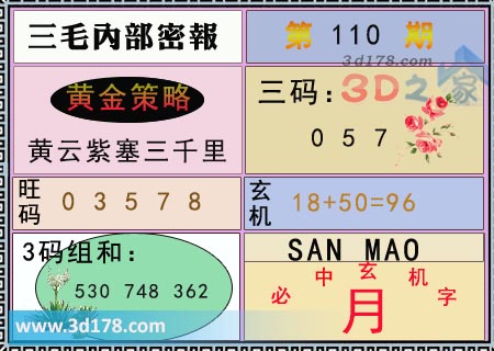 福彩3d第20110期三毛内部密报综合推荐如下:
