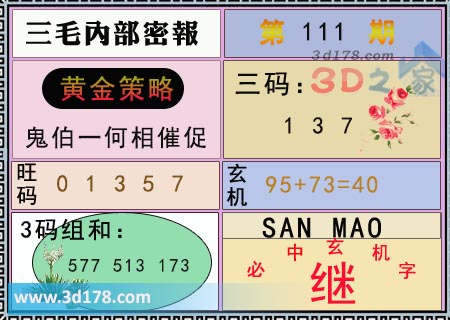 福彩3d第20111期三毛内部密报综合推荐如下: