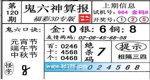 3d第20120期鬼六神算报为您推荐鬼六口诀: