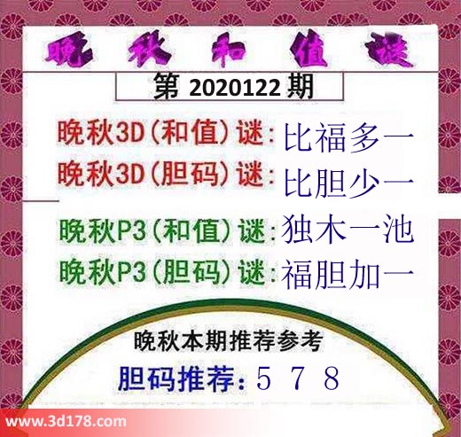 晚秋p3(胆码)谜:福胆加一
