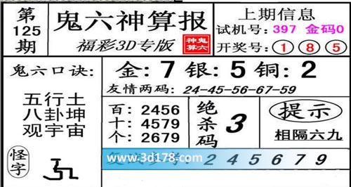3d第20125期鬼六神算报为您推荐鬼六口诀: