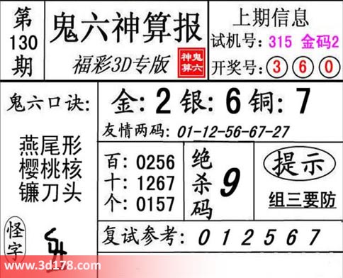 3d第20130期鬼六神算报为您推荐鬼六口诀: