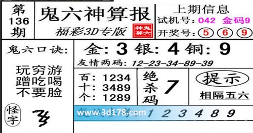 3d第20136期鬼六神算报为您推荐鬼六口诀: