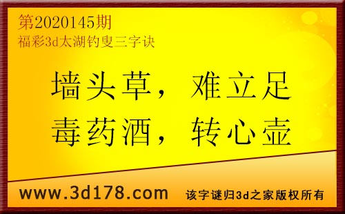 3d第20145期太湖字谜:墙头草,难立足,毒药酒,转心壶