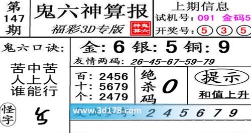 3d第20147期鬼六神算报为您推荐鬼六口诀: