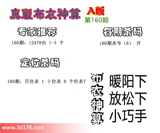 160期杀号(6) 开160期:12478出 1-3 个160期:百位杀 1 十位杀 0 个位杀7布衣神算:暖阳下 放松下 小巧手
