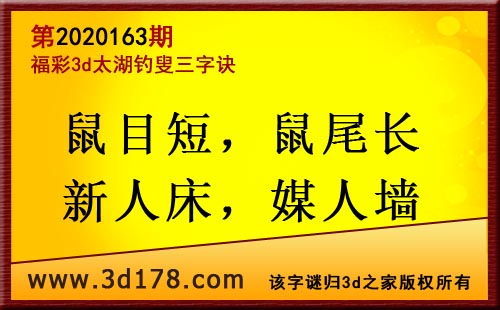 3d第20163期太湖字谜:鼠目短,鼠尾长,新人床,媒人墙