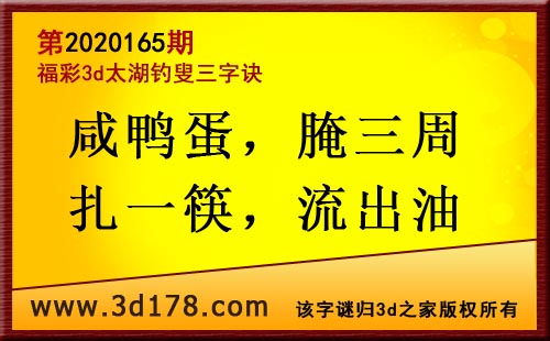 3d第20165期太湖字谜:咸鸭蛋,腌三周,扎一筷,流出油