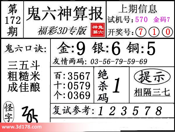 3d第20172期鬼六神算报为您推荐鬼六口诀: