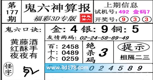 3d第20177期鬼六神算报为您推荐鬼六口诀: