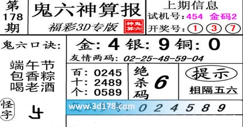 3d第20178期鬼六神算报为您推荐鬼六口诀: