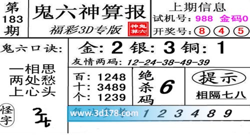 3d第20183期鬼六神算报为您推荐鬼六口诀: