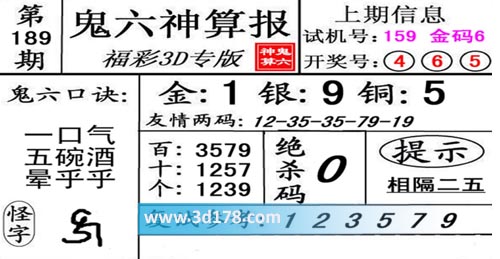 3d第20189期鬼六神算报为您推荐鬼六口诀: