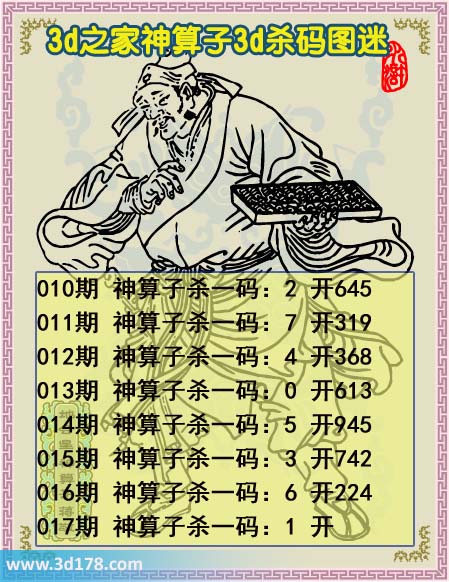 福彩3d第2014017期神算子杀码图:010期 神算子杀一码:2 开645011期 神算子杀一码:7 开319012期 神算子杀一码:4 开368013期 神算子杀一码:0 开613014期 神算子杀一码:5 开945015期 神算子杀一码:3 开742016期 神算子杀一码:6 开224017期 神算子杀一码:1 开