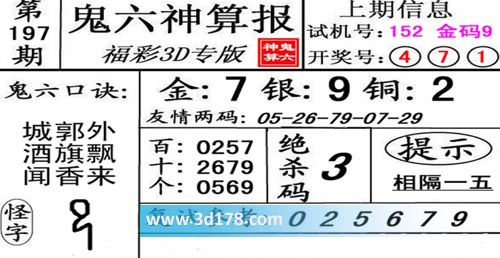 3d第20197期鬼六神算报为您推荐鬼六口诀: