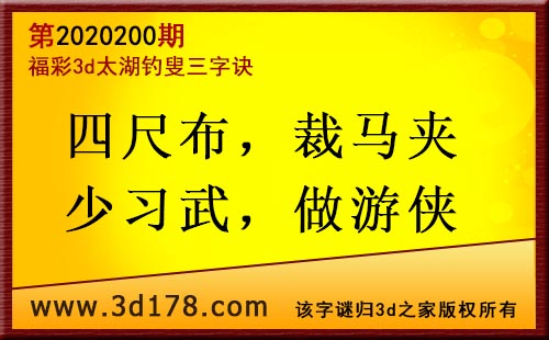 3d第20200期太湖字谜:四尺布,裁马夹,少习武,做游侠