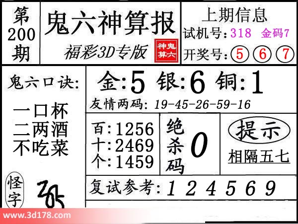 3d第20200期鬼六神算报为您推荐鬼六口诀: