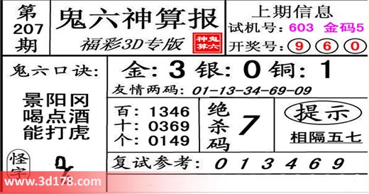 3d第20207期鬼六神算报为您推荐鬼六口诀: