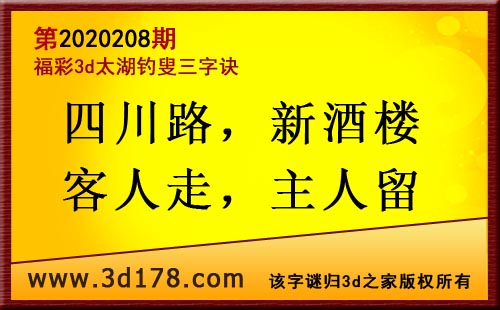 3d第20208期太湖字谜:四川路,新酒楼,客人走,主人留