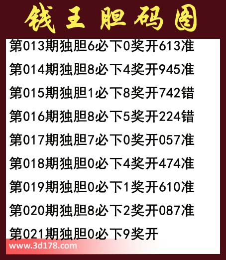第013期独胆6必下0奖开613准第014期独胆8必下4奖开945准第015期独胆1必下8奖开742错第016期独胆8必下5奖开224错第017期独胆7必下0奖开057准第018期独胆0必下4奖开474准第019期独胆0必下1奖开610准第020期独胆8必下2奖开087准第021期独胆0必下9奖开