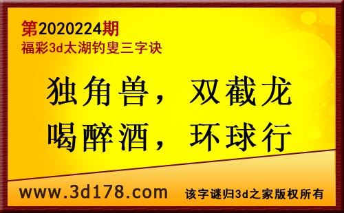 3d第20224期太湖字谜:独角兽,双截龙,喝醉酒,环球行