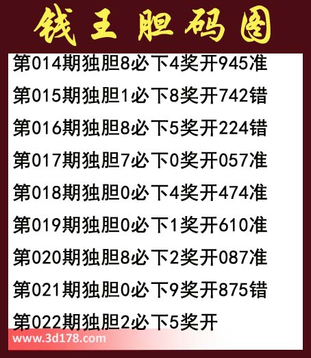 第014期独胆8必下4奖开945准第015期独胆1必下8奖开742错第016期独胆8必下5奖开224错第017期独胆7必下0奖开057准第018期独胆0必下4奖开474准第019期独胆0必下1奖开610准第020期独胆8必下2奖开087准第021期独胆0必下9奖开875错第022期独胆2必下5奖开