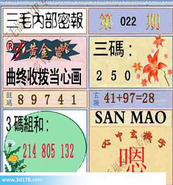 福彩3d第2014022期三毛内部密报图