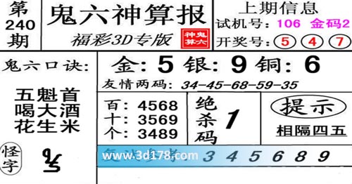 3d第20240期鬼六神算报为您推荐鬼六口诀: