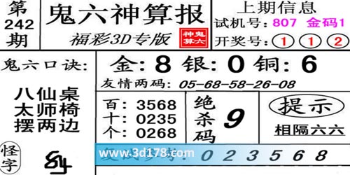 3d第20242期鬼六神算报为您推荐鬼六口诀: