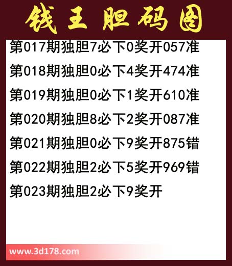 第017期独胆7必下0奖开057准第018期独胆0必下4奖开474准第019期独胆0必下1奖开610准第020期独胆8必下2奖开087准第021期独胆0必下9奖开875错第022期独胆2必下5奖开969错第023期独胆2必下9奖开