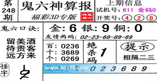 3d第20248期鬼六神算报为您推荐鬼六口诀: