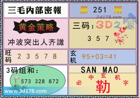 福彩3d第20251期三毛内部密报综合推荐如下: