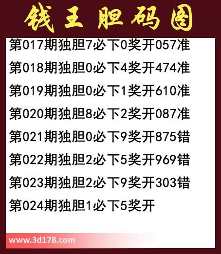 第017期独胆7必下0奖开057准第018期独胆0必下4奖开474准第019期独胆0必下1奖开610准第020期独胆8必下2奖开087准第021期独胆0必下9奖开875错第022期独胆2必下5奖开969错第023期独胆2必下9奖开303错第024期独胆1必下5奖开