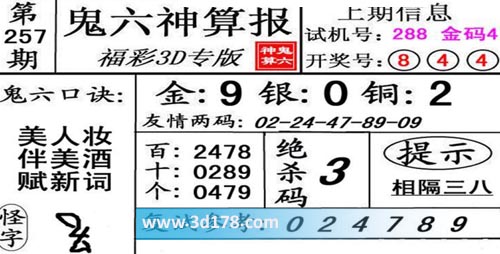 3d第20257期鬼六神算报为您推荐鬼六口诀: