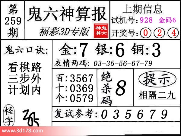 3d第20259期鬼六神算报为您推荐鬼六口诀: