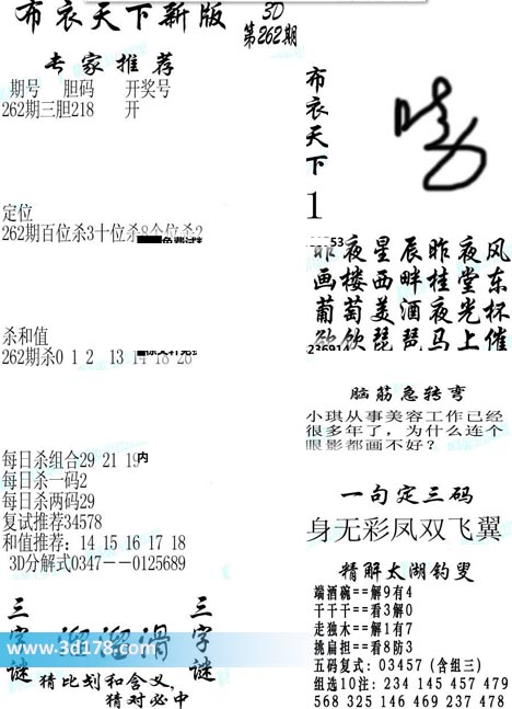 福彩3d第2020262期福彩3d布衣天下新版: