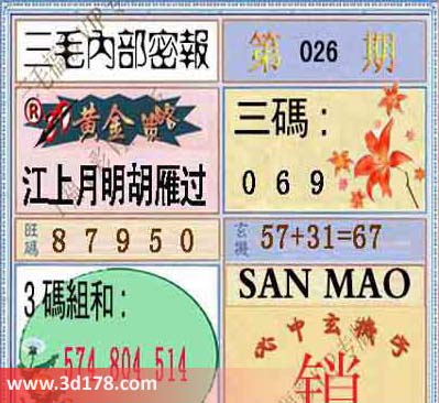 福彩3d第2014026期三毛内部密报图: