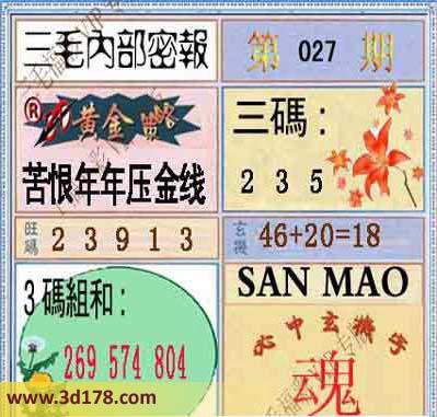 福彩3d第2014027期三毛内部密报图: