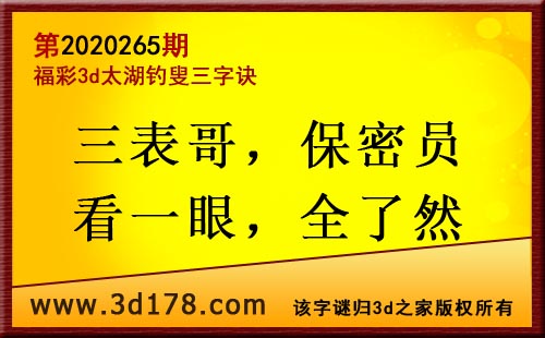 3d第20265期太湖字谜:三表哥,保密员,看一眼,全了然