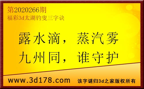 3d第20266期太湖字谜:露水滴,蒸汽雾,九州同,谁守护