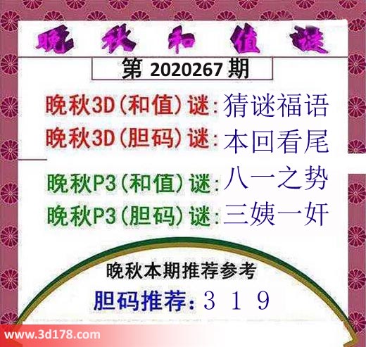 晚秋3D(胆码)谜:本回看尾